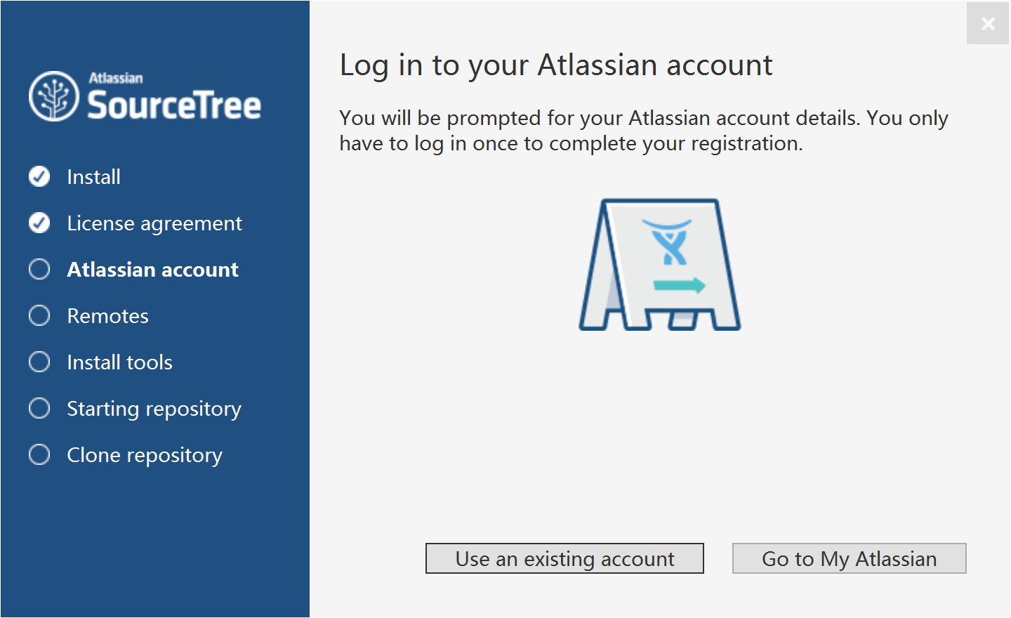 要求必须使用 Atlassian 账号登录才能继续,如果有账号的可以点"Use an existing account" 直接登录,如果没有账号可以点"Go to My Atlassian"去注册,完成后再回来登录。