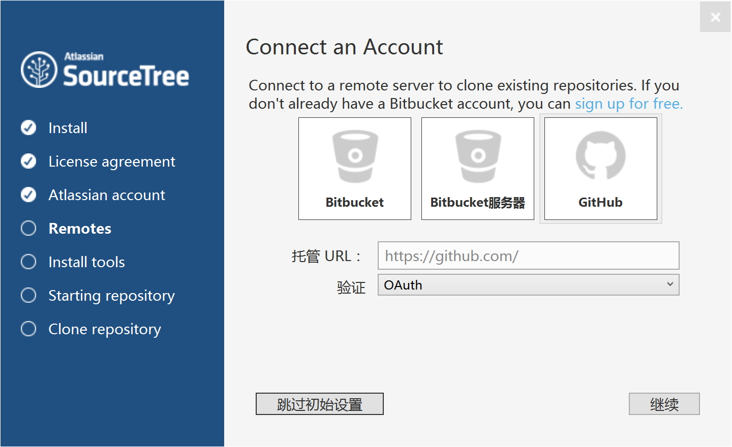 如果不需要使用 BitBucket,可以点"跳过初始设置".
